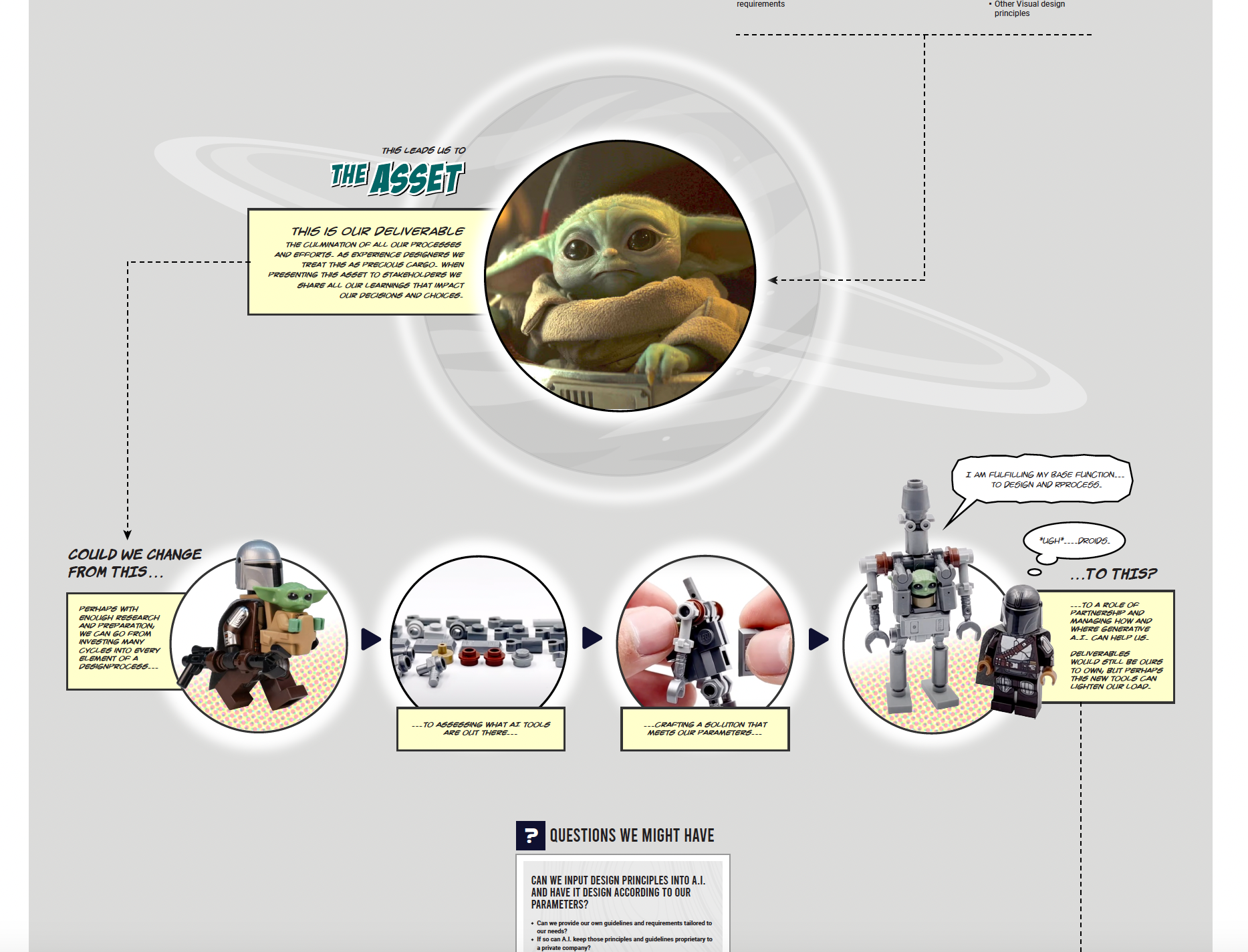 We can sometimes get fixated on a linear way of thinking, much like the familiar “waterfall” approach. But in the example above, we are adapting to a model closely related to Agile. It makes sense to adapt our workflow to what most of the software industry does, so that there is fluidity between developers and designers. We don’t jump into design based on inspiration of a cool idea - we have to act pragmatically. We layer our efforts, starting with Strategy, ending with Surface - and more importantly - they can overlap without compromising capacity or velocity of project work. It this exercise, we are looking to see if in a future-state, A.I. can eventually be leveraged to help us with some of these tasks.