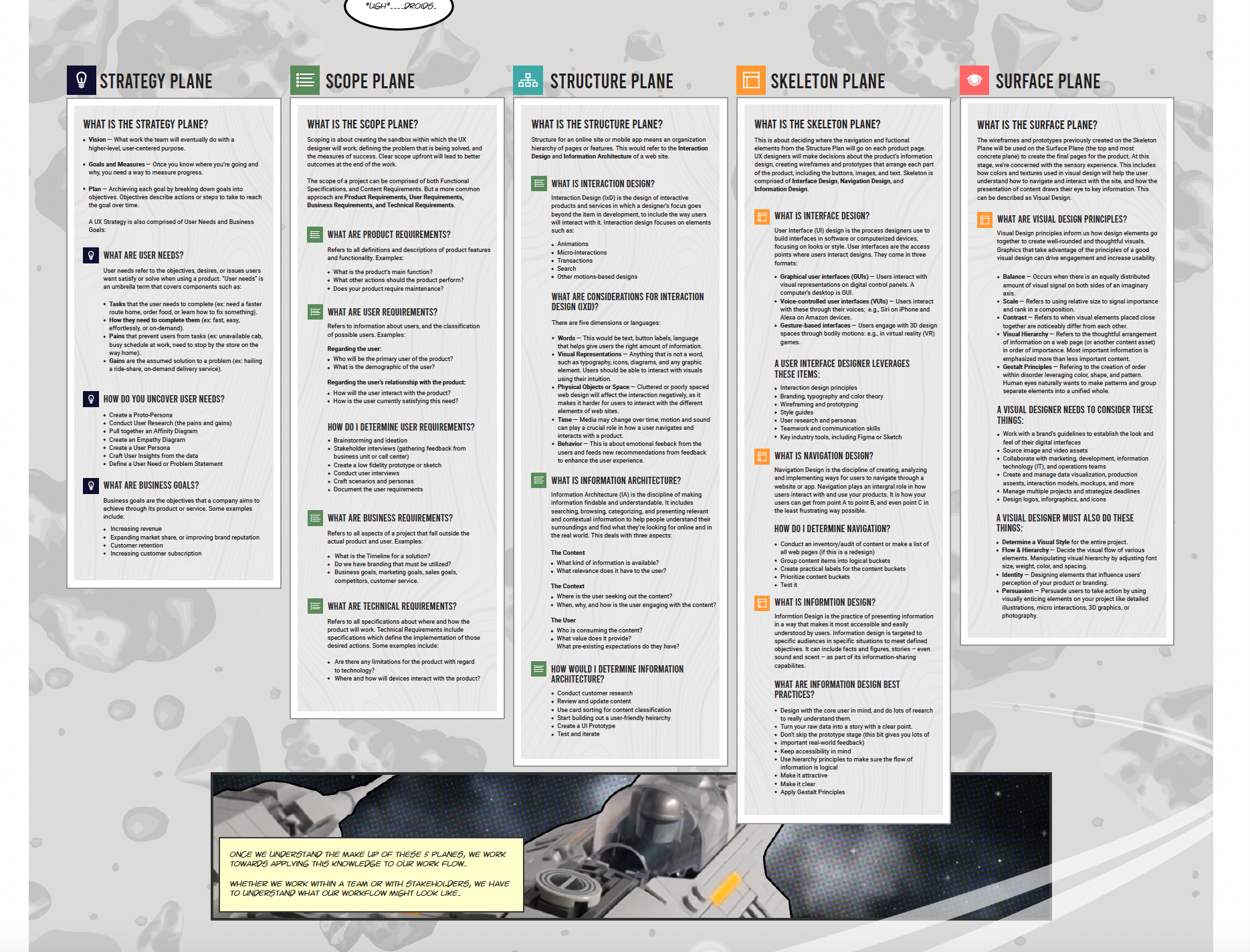 I needed to provide a crash-course on what XD (Experience Design) and UCD (User-Experience Design). I didn’t want to just reference a book or an online source and tell them, “Hey, you all need to read this” - I wanted to help them absorb many concepts quickly. More importantly, I wanted them to walk away with a single artifact - something concise and simple.