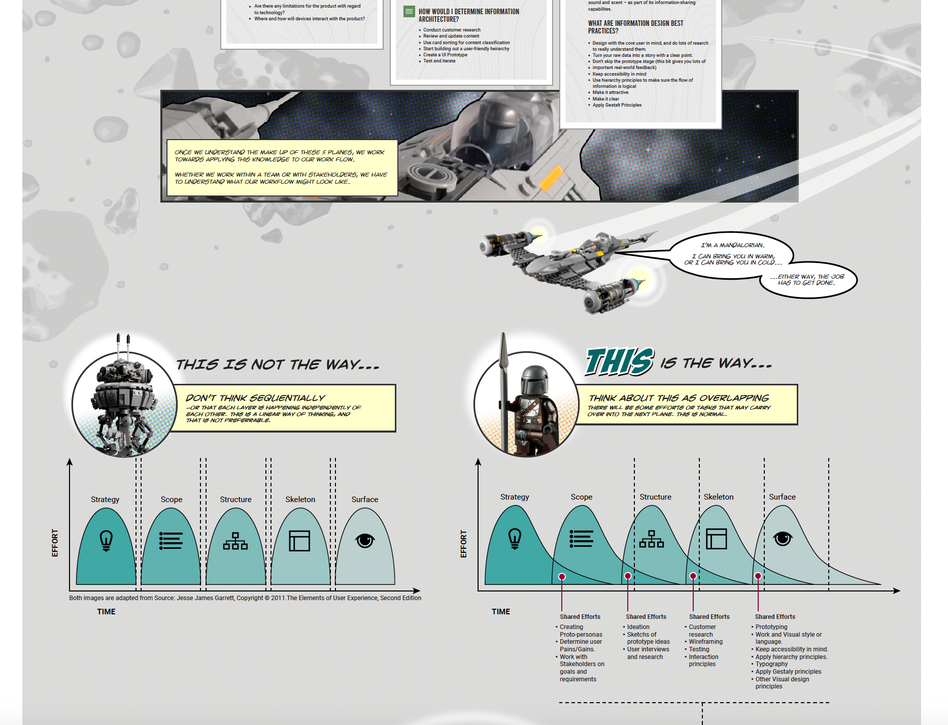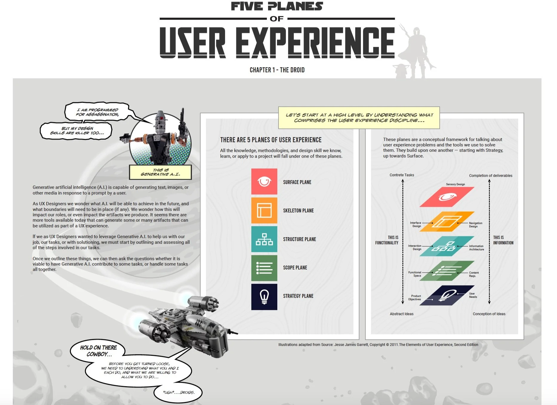 Working with the basic elements presented in Jesse James Garrett’s book “The Elements of User Experience”, I wanted to share an aspect of this book using Analogy. Given I am part of this research effort to explore Generative A.I.,I thought about the fun I could have using a character from pop-culture to tell a story, using an infographic format. The reasons were: